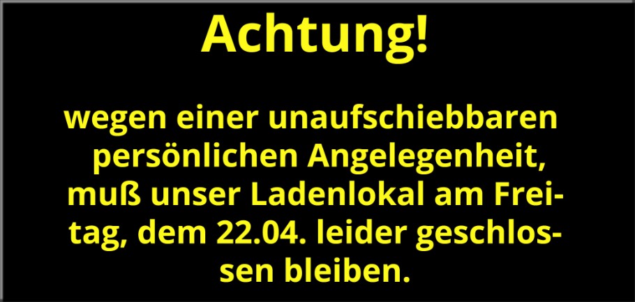 Wir sind dann mal weg und wünschen Allen ein schönes langes Wochenende - ab Montag sind wir wieder für Euch da!
