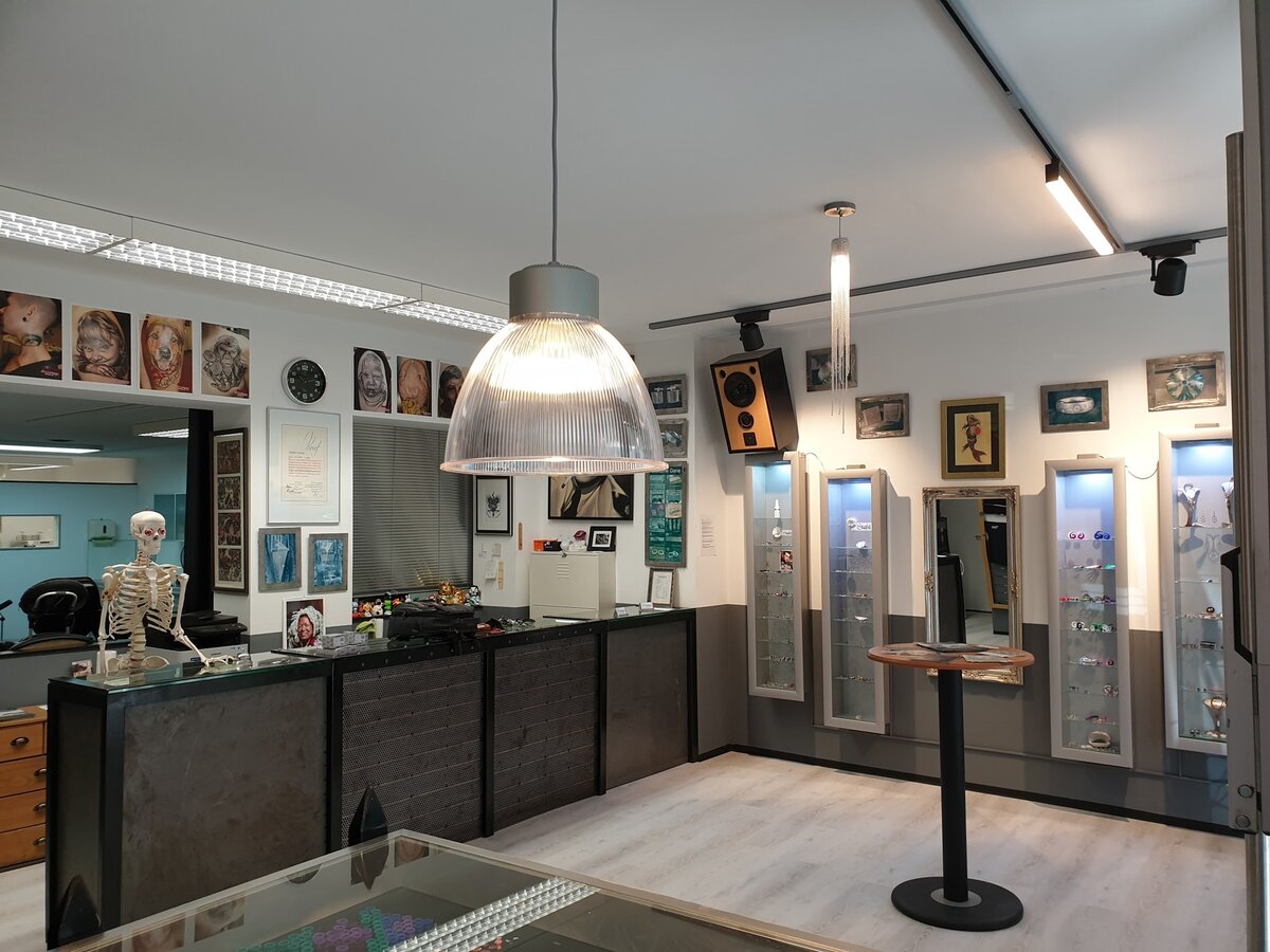 Später (1993), etwa zur selben Zeit als ich die Ausbildung zur Goldschmiedin („anständiger Beruf") begann, sollte ich zum ersten mal eine Tattoomaschine in die Hand nehmen. Seit dem begleiten diese beiden Tätigkeiten der Schmuckgestaltung mich, und ich könnte mich für keine entscheiden, wäre ich vor die Wahl gestellt... Wer sich für mein Schmuckangebot interessiert, kann sich auf www.schmuckhandwerk.com darüber informieren. Seit dem Jahr 2008 befindet sich mein Studio nun in der Mülheimer Innenstadt. Der helle Eingangsbereich bietet genügend Platz, um ausgiebig und in Ruhe nach Anregungen aus zahlreichen Motivvorschlägen für seine neue Tätowierung zu stöbern.