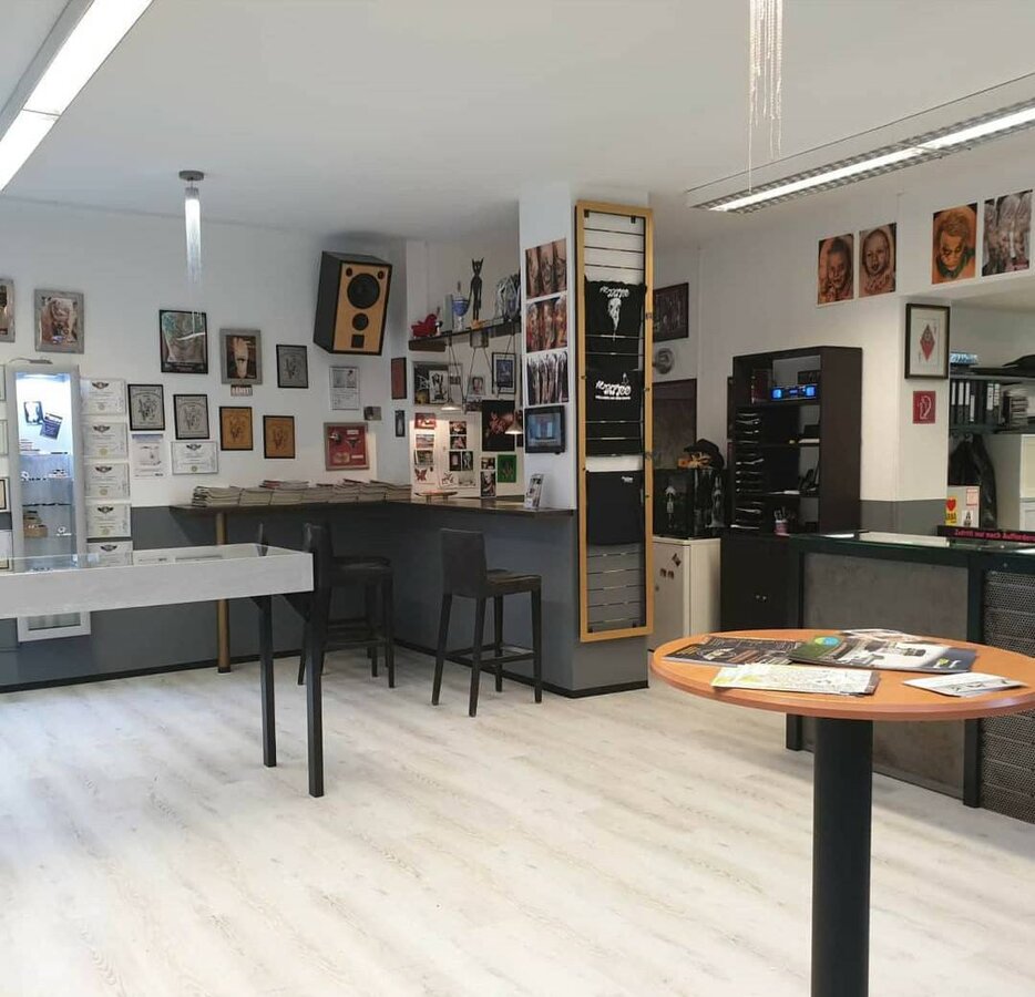 Später (1993), etwa zur selben Zeit als ich die Ausbildung zur Goldschmiedin („anständiger Beruf") begann, sollte ich zum ersten mal eine Tattoomaschine in die Hand nehmen. Seit dem begleiten diese beiden Tätigkeiten der Schmuckgestaltung mich, und ich könnte mich für keine entscheiden, wäre ich vor die Wahl gestellt... Wer sich für mein Schmuckangebot interessiert, kann sich auf www.schmuckhandwerk.com darüber informieren. Seit dem Jahr 2008 befindet sich mein Studio nun in der Mülheimer Innenstadt. Der helle Eingangsbereich bietet genügend Platz, um ausgiebig und in Ruhe nach Anregungen aus zahlreichen Motivvorschlägen für seine neue Tätowierung zu stöbern.